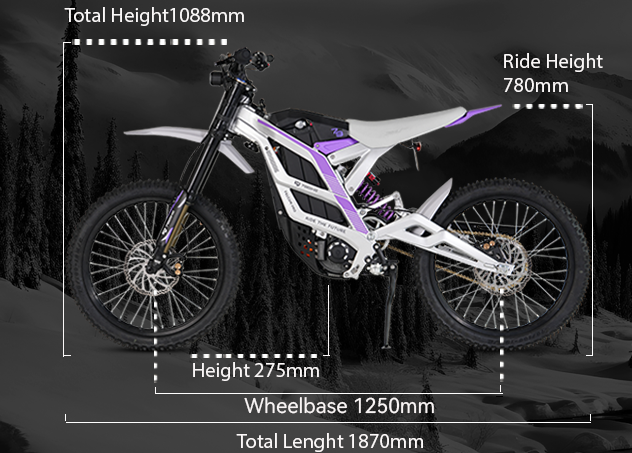 Wheel typeSpoke wheel-Aluminum alloy 19*1.4Tyre typeOff-road tires -70/100-19Primary drive systemHTD 8M belt 560mm+20mm WidthSecondary drive system420 chain 106 knotsSuspension system(Front)Fully adjustable shoulder shock absorption -travel 200mmSuspension system(Rear)Multi-link fully adjustable external airbag hydraulic shock absorber-stroke 85mmLighting systemFull LED low beam + high beam(black)+ turn signal+ brake light